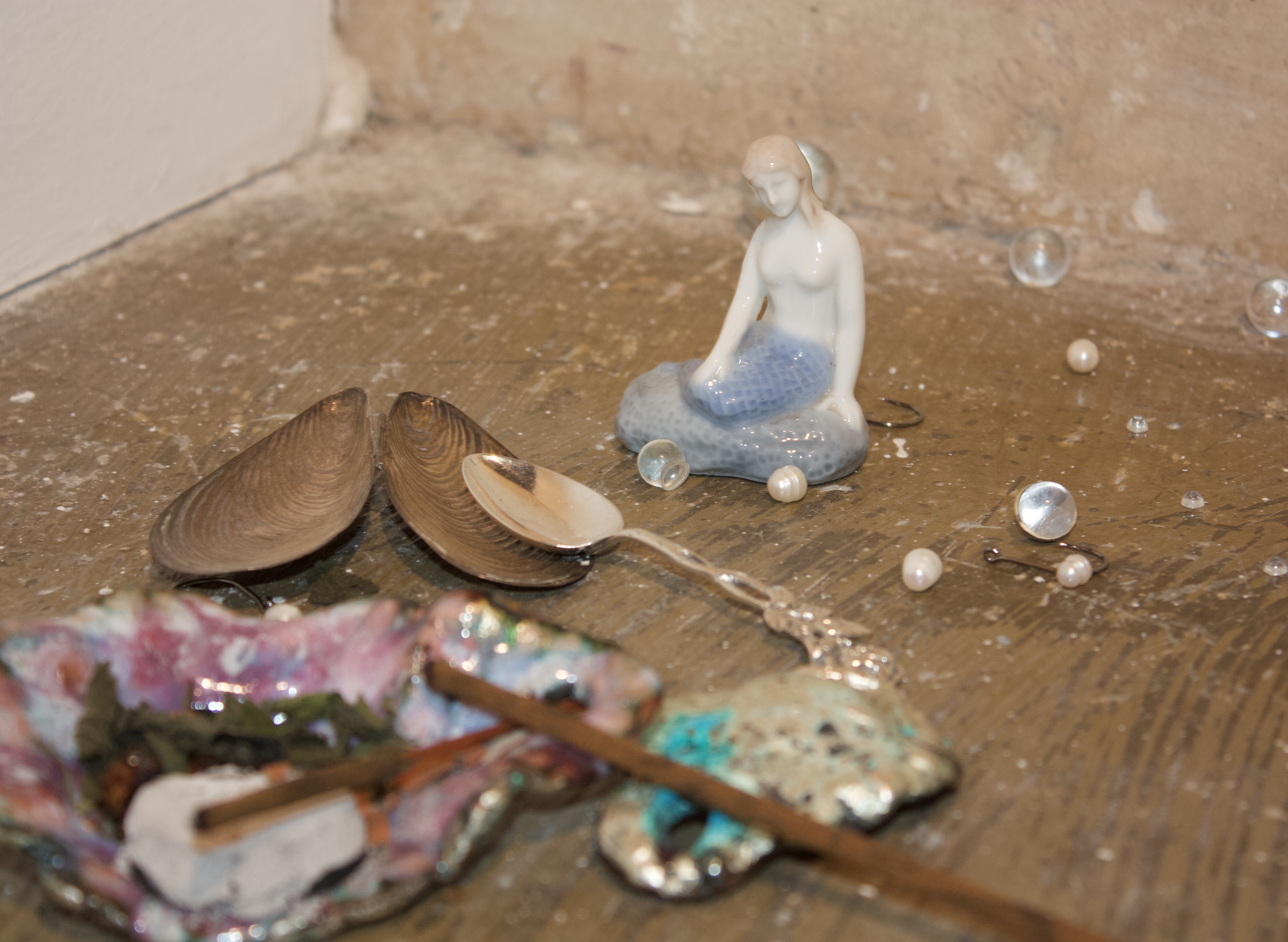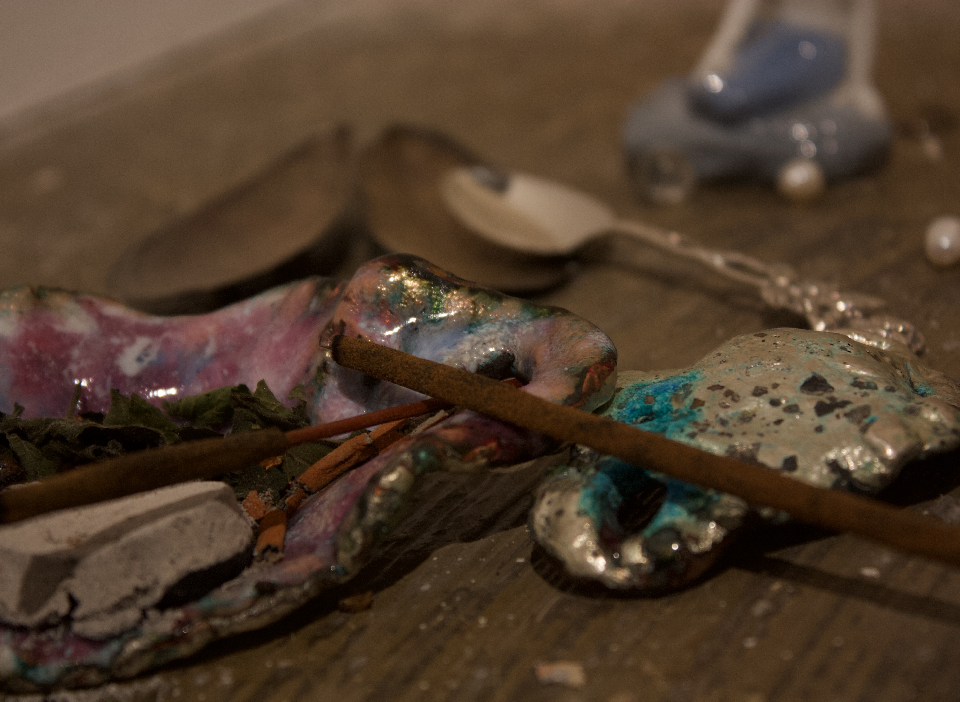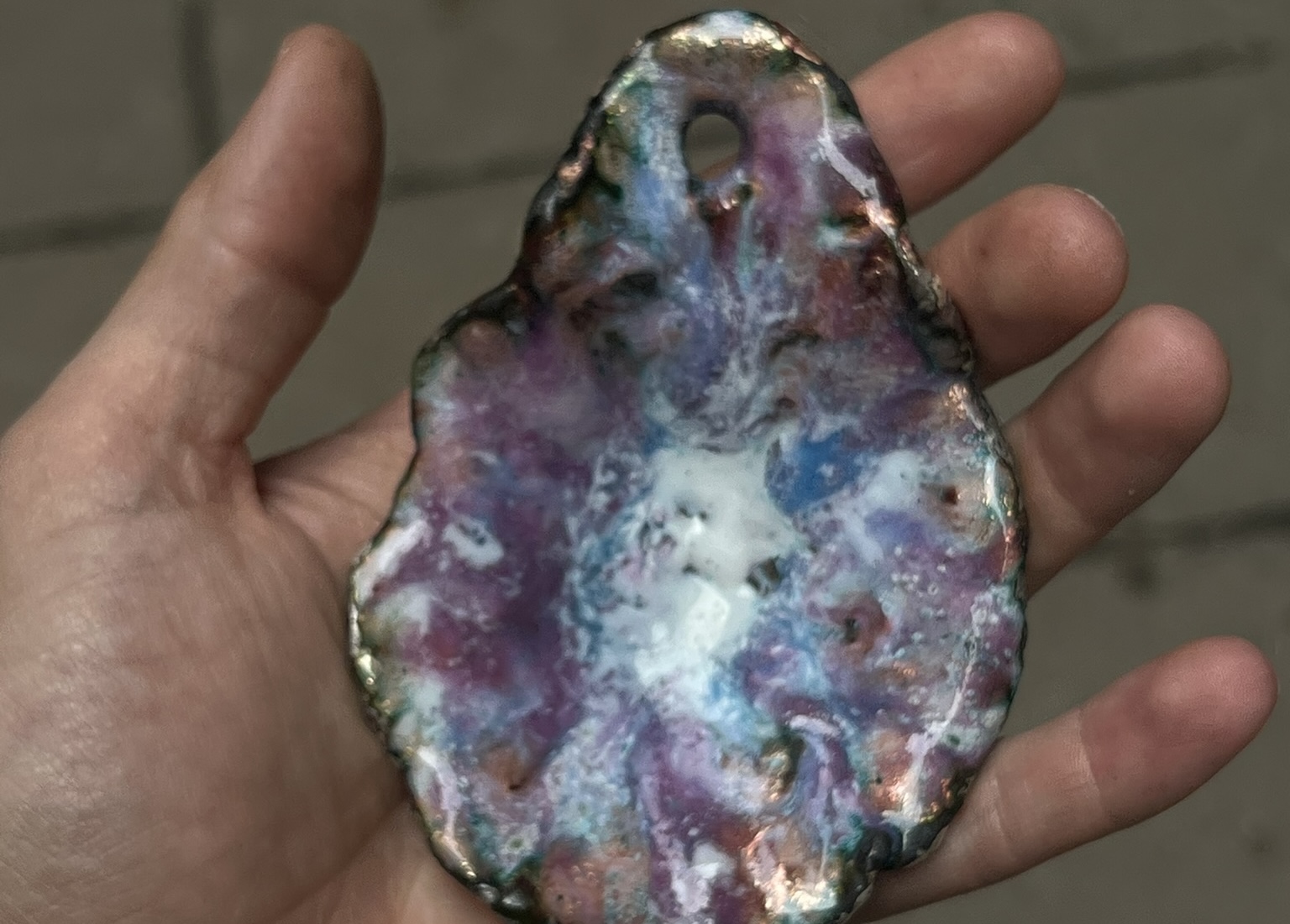 Closca feta en ceràmica amb esmalts de diversos colors, que generen una superfície lluent i orgànica. El contorn irregular i el forat superior permeten usar-la com a peça decorativa o amulet. Forma part d’una sèrie d’objectes inspirats en elements naturals.