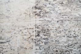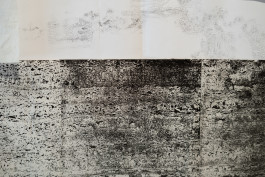 «La Preñada» trabaja justamente desde esta asunción. Los dibujos que encontramos en el primer espacio de la galería testimonian el trabajo lento y dilatado de comprensión de un fragmento de travertino a través de una técnica hidrófila como es la litografía. En el centro de la sala, una losa rota procedente del Pabellón Mies Van der Rohe e inoculada con musgo el día de la inauguración de la exposición, invita la vida. La losa es objeto de curas continuas por parte de las artistas, las galeristas y los visitantes, que diariamente humedecen la piedra con agua y la protegen de noche. Los utensilios de curas ocupan el tercer ámbito de la sala, dominado por el tubo de látex, que como un cordón umbilical alimenta la losa de travertino y la conecta indisolublemente con el sitio— antes de la aparición de «La Preñada», bacterias, algas y musgo son ya presentes en el espacio expositivo en forma de quistes y esporas aéreas.